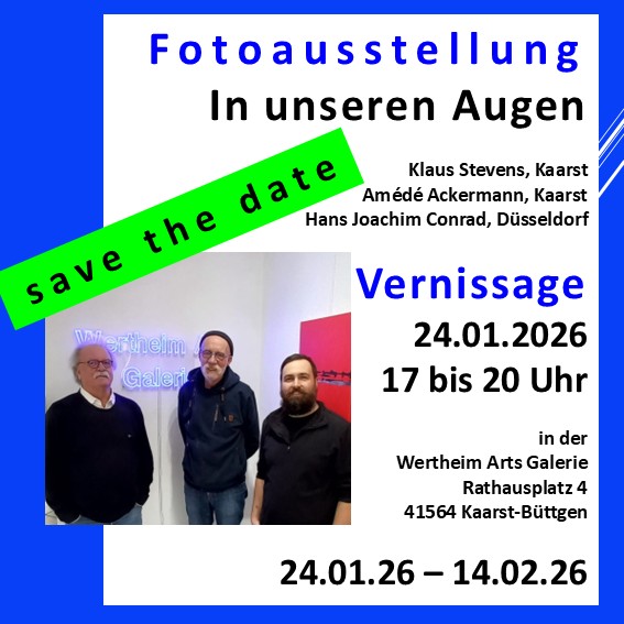 Mit der Fotoausstellung "In unseren Augen" startet die Wertheim Arts Galerie in Büttgen in ihr neues Veranstaltungsjahr. Ende Januar werden mehr als 20 Kunstwerke von drei Fotografen aus Kaarst und Düsseldorf vorgestellt. In Kooperation mit dem Kulturforum Kaarst entstand eine sehenswerte Ausstellung, auf der Klaus Stevens seine bewegenden, detailreichen Naturaufnahmen präsentiert, Amédé Ackerman seine Fotomontagen zwischen Realität und Fiktion zeigt und Hans-Joachim Conrad mit seinen abstrakt-impressionistischen Fotos beteiligt ist. Vernissage ist am 24. Januar von 17 bis 20 Uhr. Die Laudatio hält Fotokünstlerin Hilla Baecker, Leiterin des Kulturbahnhofs Korschenbroich. Die unterschiedlichen Arbeitsweisen der drei Fotokünstler und deren Licht-, Formen- und Farbgebungen kann man in der Kunstgalerie am Rathausplatz 4 in Büttgen noch bis zum Valentinstag entdecken. Der Titel "In unseren Augen" spiegelt ihre gemeinsame Leidenschaft für die Fotografie wider. Der Eintritt ist frei. Weitere Informationen finden Sie unter wertheim-arts.net.