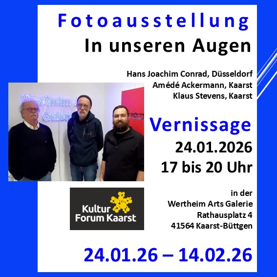 Die Fotoausstellung "In unseren Augen" umfasst rund 20 Kunstwerke von drei Fotografen aus Kaarst und Düsseldorf.In Kooperation mit dem Kulturforum Kaarst entstand eine sehenswerte Ausstellung, auf der Klaus Stevens seine bewegenden, detailreichen Naturaufnahmen präsentiert, Amédé Ackerman seine Fotomontagen zwischen Realität und Fiktion zeigt und Hans-Joachim Conrad mit seinen abstrakt-impressionistischen Fotos beteiligt ist. Vernissage ist am 24. Januar von 17 bis 20 Uhr. Die Laudatio hält Fotokünstlerin Hilla Baecker, Leiterin des Kulturbahnhofs Korschenbroich. Die unterschiedlichen Arbeitsweisen der drei Fotokünstler und deren Licht-, Formen- und Farbgebungen kann man in der Wertheim Arts Galerie am Rathausplatz 4 in Büttgen noch bis zum Valentinstag entdecken. Der Titel "In unseren Augen" spiegelt ihre gemeinsame Leidenschaft für die Fotografie wider. Der Eintritt ist frei. Weitere Informationen finden Sie unter wertheim-arts.net.